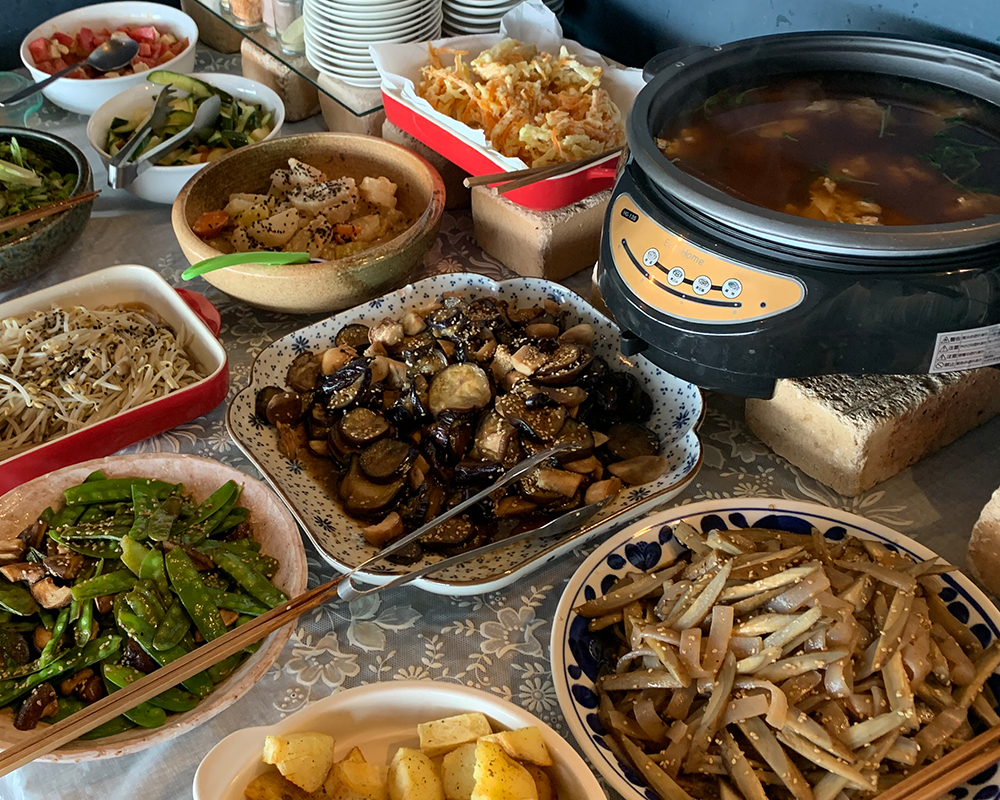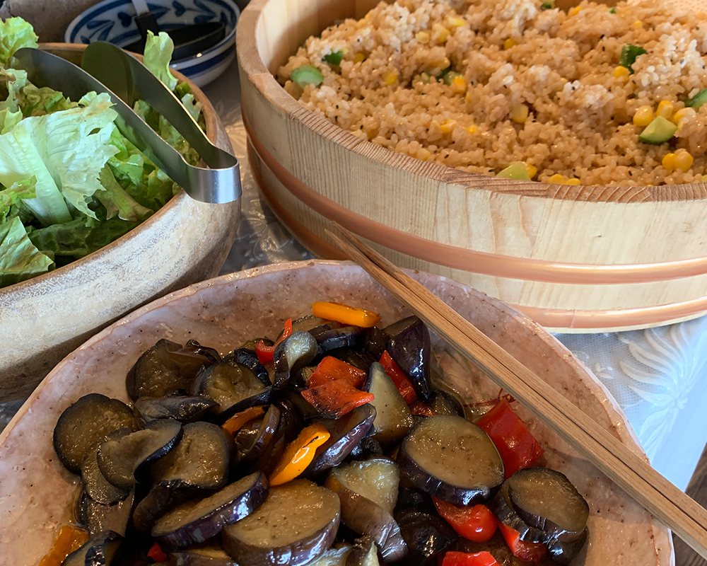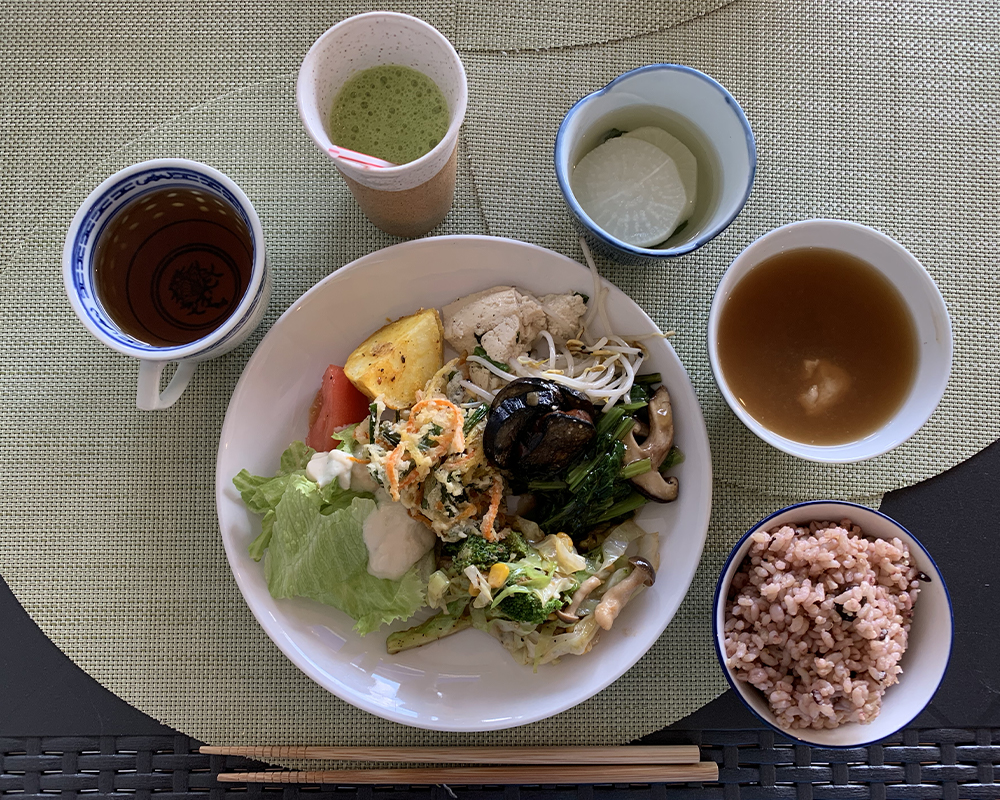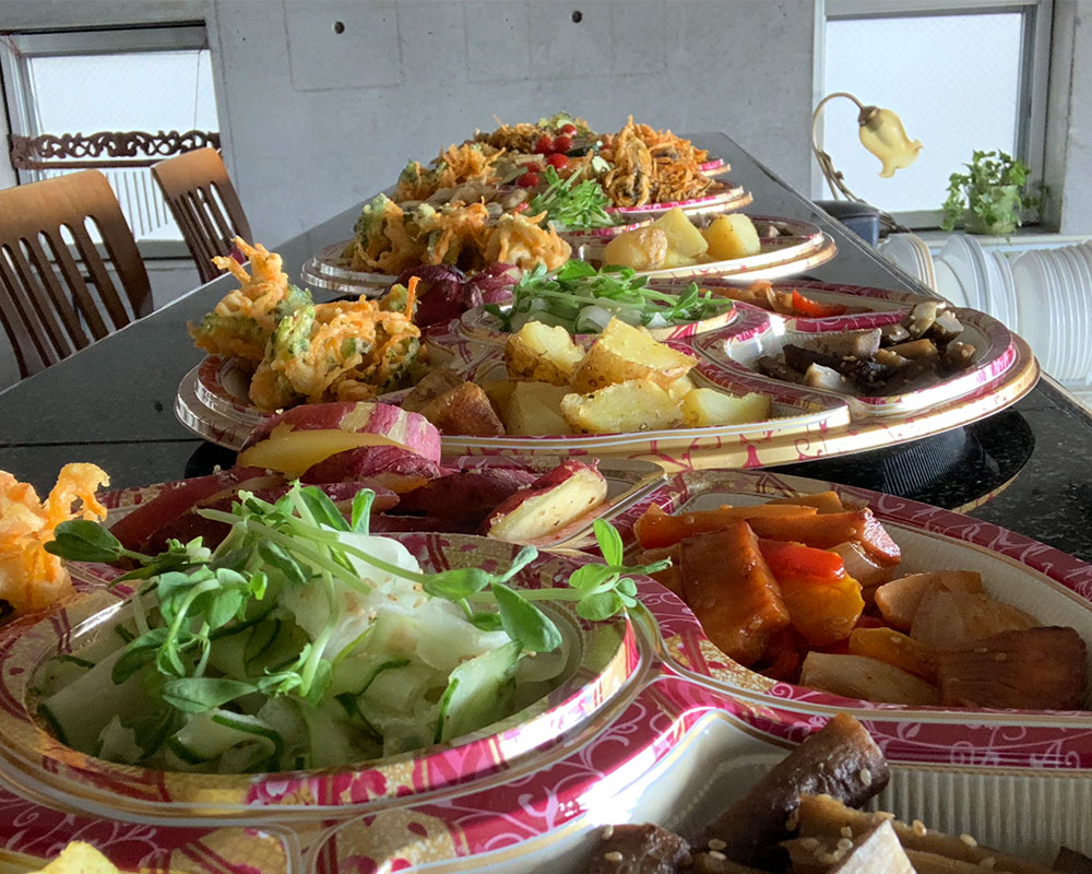 ランチタイムはビュッフェスタイル。 たくさんの野菜料理から食べたい料理をお好みでお楽しみいただけます。 野菜料理以外にもライス、スープ、ドリンクもご自由にお召し上がりください。 アレルギー・ビーガン・五葷抜きにも対応しています。 砂糖、乳製品、卵不使用のケーキがついたケーキセットもおすすめです。 ケーキはホワイトソルガム使用のグルテンフリーです。